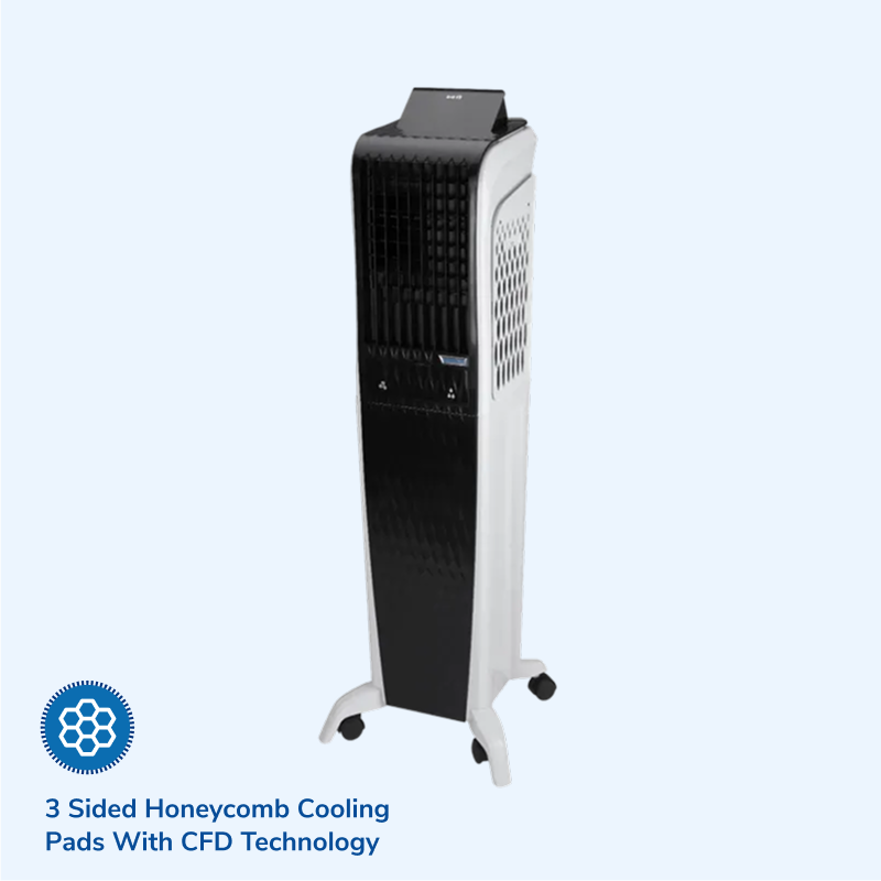 The tower design of the cooler along with oscillating louvers ensures airflow to body-level comfort, while the slim design makes it convenient to fit comfortably into compact spaces.